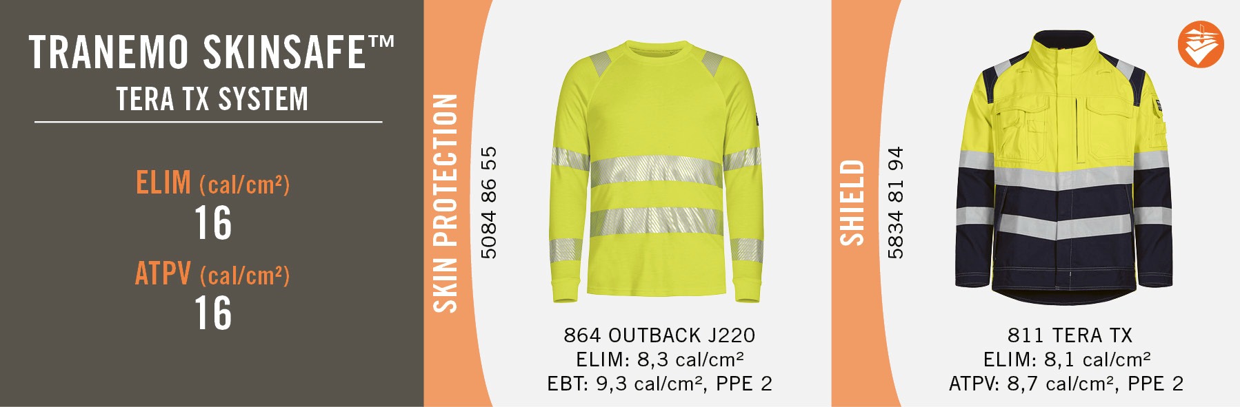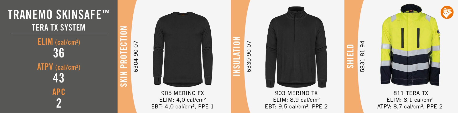 Kun useita paloturvallisia vaatteita käytetään samanaikaisesti, suojaus lisääntyy huomattavasti. Tranemo suosittelee kahden tai useamman suojavaatekerroksen käyttöä mikä auttaa pitämään lämpöisenä ja suojattuna. Tranemo testaa kaikki uudet vaatteet ja tulee uudelleen testaamaan Tranemo Skinsafe™ järjestelmämme sekä varastossa olevat vaatteet, tarkistetun standardin EN 61482-2:2020 mukaan joka sisältää uudet ELIM ja ATPV/EBT arvot.